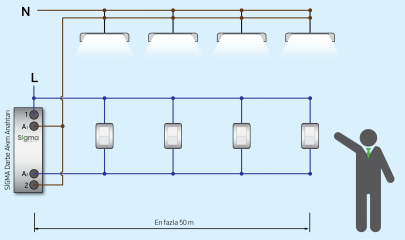 Çok geniş alanlara yayılmış aydınlatma sistemleri hem giriş hem de çıkış noktasında birbirine paralel bağı liht butonlar ile kumanda edilir. İşletmelerde hem enerji tasarrufu hem de iş gücü tasarrufu Sigma Darbe Akım Anahtarı ile kolayca sağlanır.