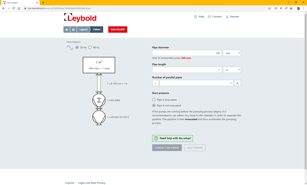 Çevrimiçi yapılandırıcıdan sorumlu BT Müdürü Hannes Kamecke: ' Bir vakum sisteminin odaları ve pompalarına ek olarak, boru hatlarının farklı etkileri de dikkate alınır. Bunlar arasında tüm basınç aralıklarında ve akış rejimlerinde iletkenlik etkileri, bloklama ve tabii ki hatların hacmi yer alır. Bununla birlikte, diyagram, boru çapının artırılması gerektiğini hemen gösterir,' dedi. Bazı durumlarda, daha yüksek bireysel performansa sahip bir pompanın genel vakum performansını iyileştirmeyeceği anlaşılmaktadır, çünkü azalmalar yanlış boyutlandırılmış bir boru hattından kaynaklanmaktadır.