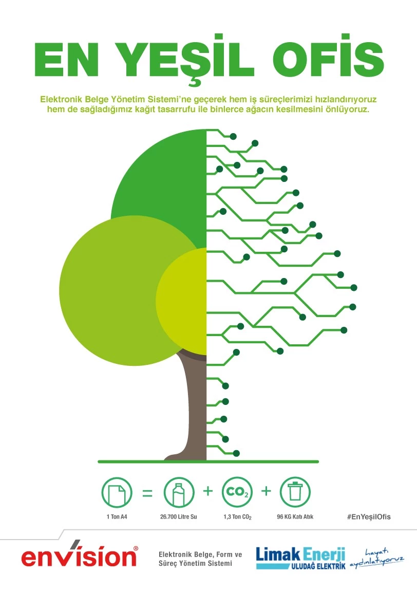 Enerji sektörünün öncü kurumu Limak Enerji, Elektronik Belge Yönetim Sistemi sayesinde 11 bin 643 ağacın kesilmesini önledi. enVision tarafından Van'dan İstanbul'a kadar geniş bir coğrafyada faaliyet gösteren 18 elektrik şirketinin değerlendirildiği çalışmada, Elektronik Belge Yönetim Sistemi (EBYS) kullanarak 'kağıtsız ofis' konseptine geçen Limak Enerji şirketleri; Limak Enerji Uludağ Elektrik ve Uludağ Elektrik Dağıtım (UEDAŞ) 'En Yeşil Ofis' Araştırması'nın ilk iki sırasında yer aldı.Araştırmayı gerçekleştiren enVision yetkilileri Limak Enerji Grubunu, Bursa'daki Genel Müdürlüğü'nde ziyaret ederek 'En Yeşil Ofis' plaketlerini takdim etti.