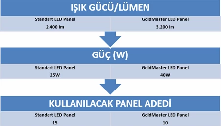 GoldMaster LED paneller, standart LED panellere göre, sağladığı yüzde 80'e varan enerji tasarrufunun yanında, metrekarede maliyeti yüzde 30 azaltıyor.
