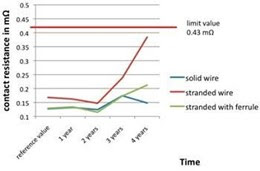 The graph below shows the change of contact resistances of a single-core rigid cable (blue), a multi-core stripped cable (burgundy), and a multi-core stripped and ferrule cable (green) over time. As can be seen, the contact resistance of many cores using ferrule is almost equal to the resistance of a single-core rigid cable.
