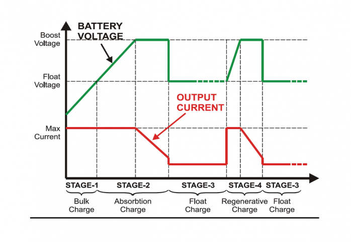 The SBC-5A has a microprocessor controlled 4-stage charging system, making it more advantageous compared to traditional 2-stage battery chargers. The smart charging algorithm keeps the battery charged at 100% capacity and provides maximum battery life by applying an automatic periodic regenerative charging cycle. Until the battery is fully charged, SBC-5A applies the highest possible charging voltage at its battery terminals, then continues applying the float voltage. This ensures that all the cells remain at full charge. The regenerative charging cycle allows full charge at the lowest possible float voltage, thus increasing battery life. This feature can be toggled on or off from the DIP switches on the device’s circuit board.