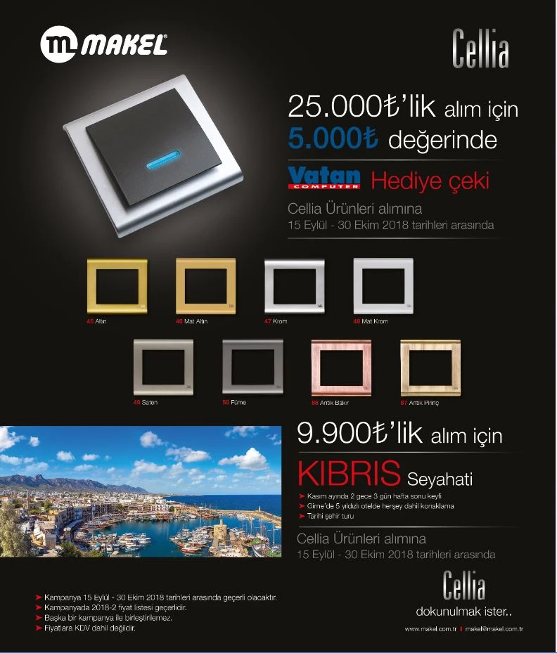 Gerçekleştirdiği kampanyalar ile her dönem dikkat çeken Makel Şirketler Grubu, 2018 yılının son aylarında da boş durmadı. Makel ürünleri içerisinde önemli bir yere sahip Cellia ürünlerine yönelik düzenlenen kampanya yoğun ilgi görmeye devam ediyor. 15 Eylül – 30 Ekim tarihleri arasında Cellia ürünlerinden 25.000 TL’lik satın alım yapan herkese 5.000 TL’lik Vatan Bilgisayar Hediye Çeki, 9.900 TL’lik satın alımlara ise Kıbrıs Seyahati alma hakkı kazanıyor.