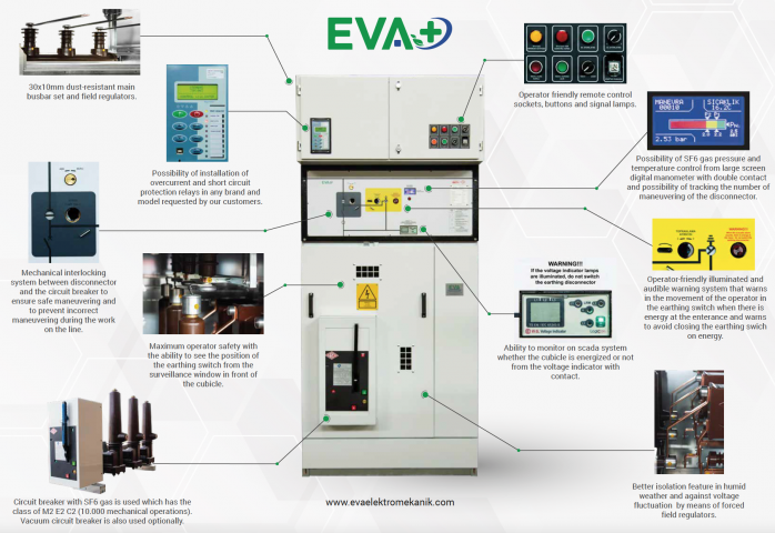 Kolay kuruluma uygun modüler yapıları sayesinde EVA+ metal mahfazalı modüler hücre, bir şalt merkezinin tüm ihtiyaçlarına kolaylıkla cevap verebilmekte; hızlı bir şekilde devreye alınabilmektedir. Bu hücrelerde bara çıkışları hava yalıtımlı olmakla birlikte elektriksel ayırma ve kesme işlemleri SF6 gaz yada vakum ortamında yapılmaktadır. Bu sayede minimum ölçüde maksimum güvenlikli bir operasyon sağlanabilmektedir. Ayrıca hücrenin 40,5 kV işletme gerilimi altında çalışma deneyi, 1625m rakım yüksekliğinde çalışma kapasitesi, ayırıcı ve yük ayırıcısında manevra sayılarını gösteren dijital gaz basınç göstergesi, girişte enerji var iken operatörü topraklama yapmaması için uyaran sesli sinyal lambası ve topraklama kontaklarını operatörün direkt olarak görebilmesi avantajı ile rakiplerinin önüne geçmekte ve operatör dostu olduğunu göstermektedir.